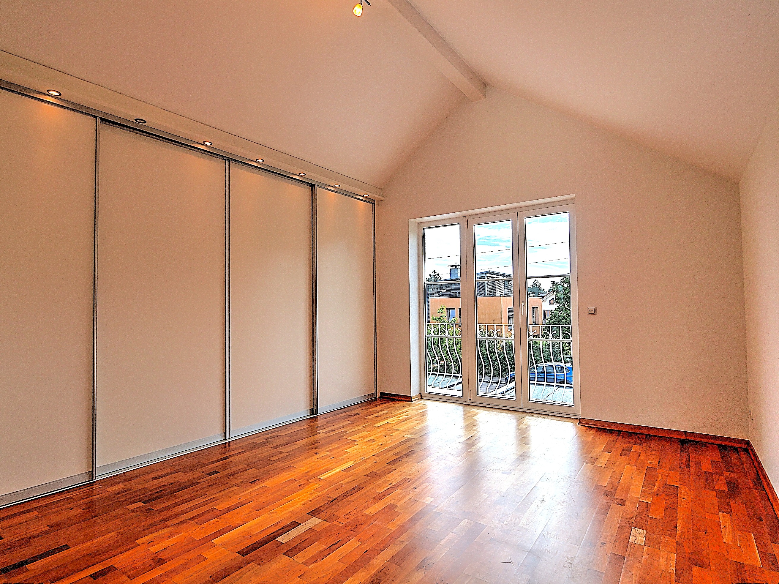 Im Obergeschoss erwarten Sie ein lichtdurchflutetes, großräumiges Zimmer mit offenem Sichtdachstuhl, abgehängter Decke und stilvollen Halogenspots. Von hier aus haben Sie Zugang zu einem Balkon mit herrlichem Ausblick. Zusätzlich gibt es ein weiteres Zimmer mit praktischem Einbauschrank und einem kleinen Balkon. Das helle Badezimmer verfügt über Badewanne, Bidet, separate Dusche und Fenster und sorgt für komfortables Wohnen.