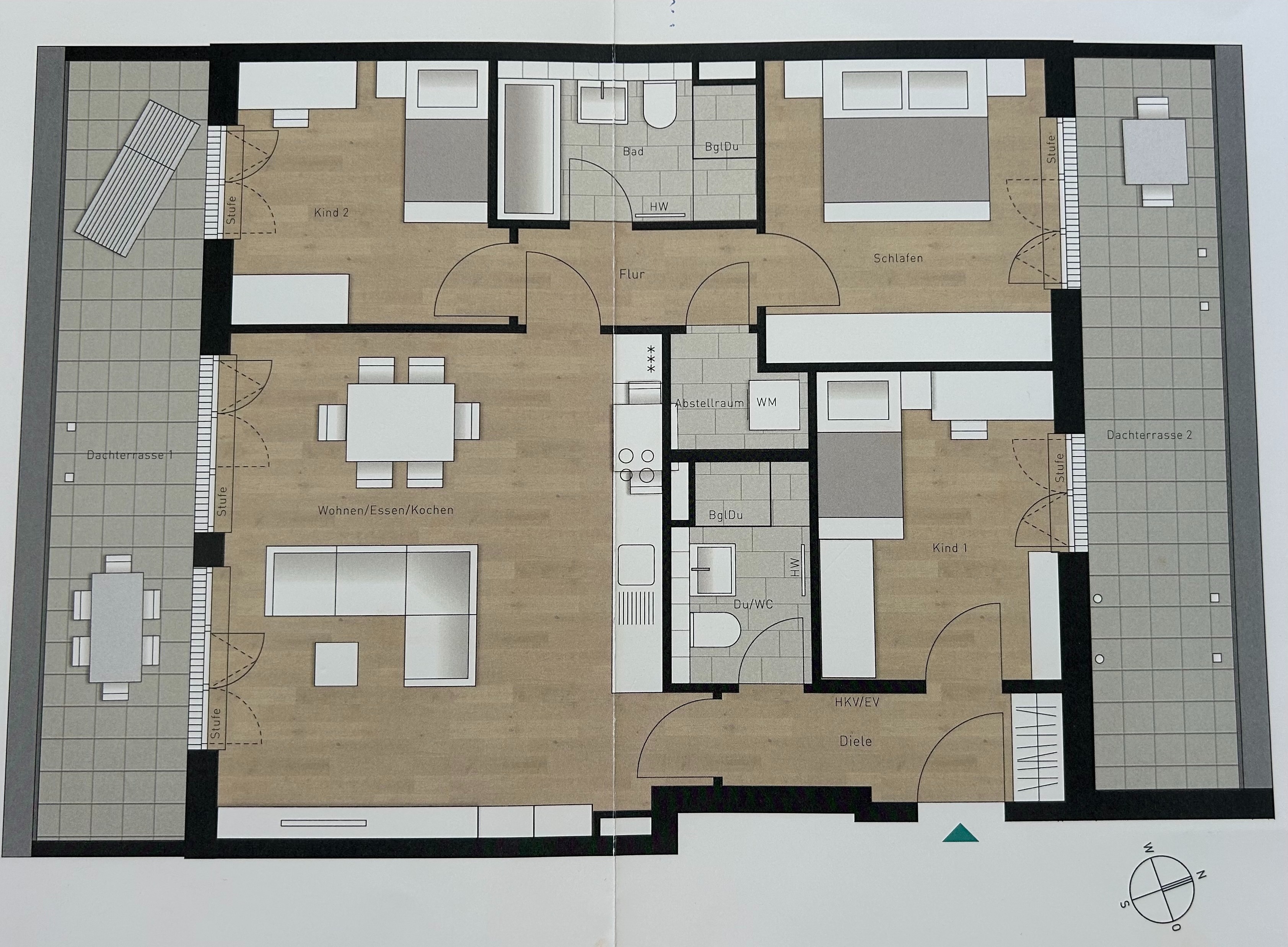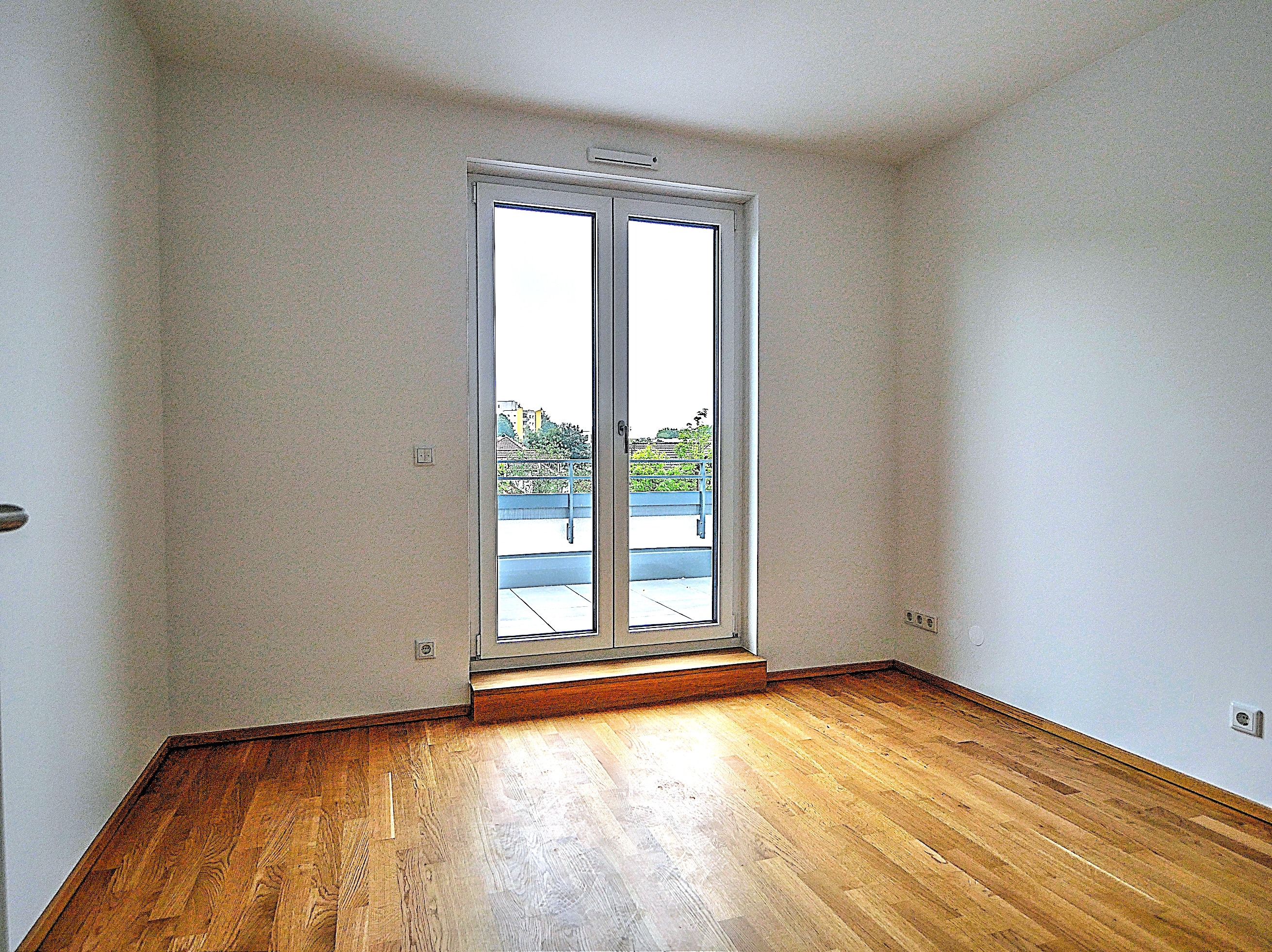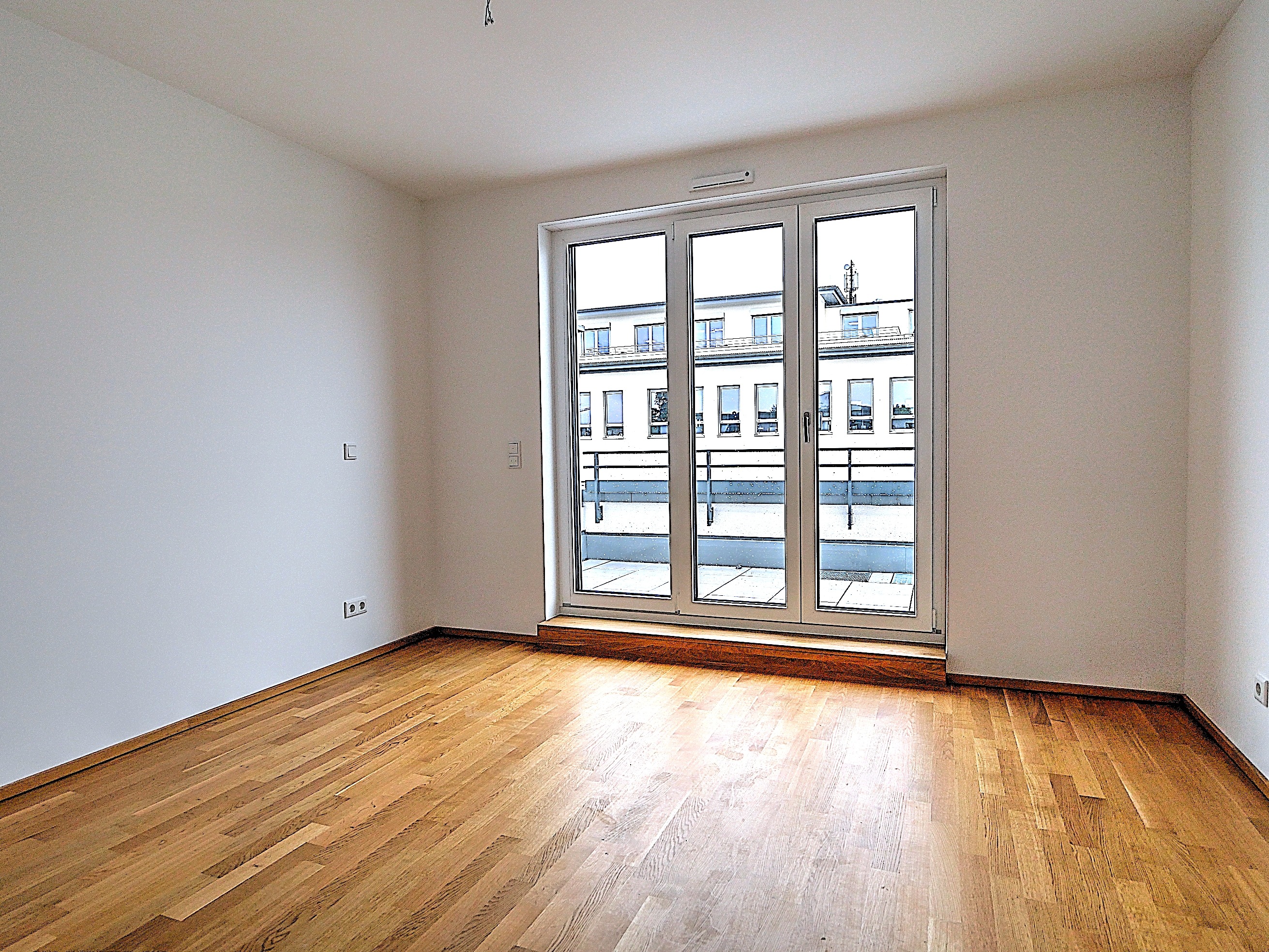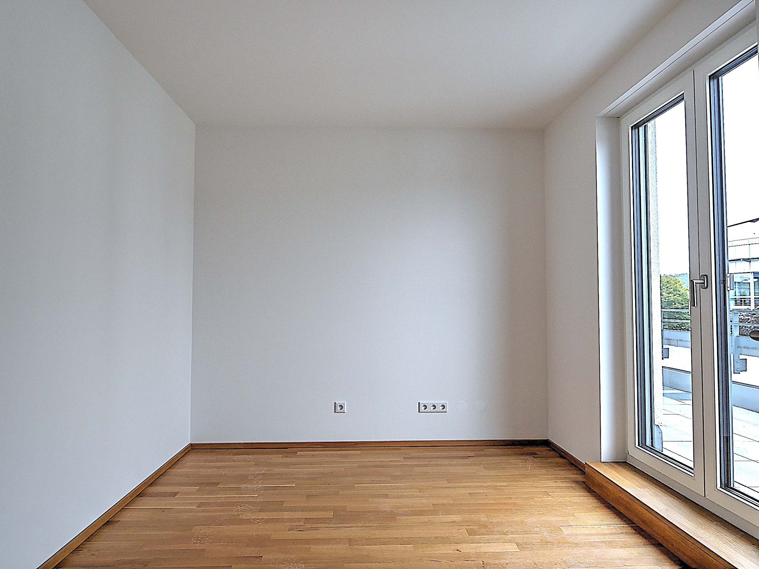Ein weiteres Schlafzimmer mit direktem Zugang zur Südwest-Terrasse schließt sich an. Über einen kleinen separaten Flurbereich gelangen Sie in den hinteren Teil der Wohnung. Dort befinden sich ein geräumiges Badezimmer mit bodengleicher Dusche, Badewanne sowie ein praktischer Abstellraum mit Waschmaschinenanschluss. Ein weiteres Schlafzimmer bietet Zugang zur zweiten Dachterrasse, die nach Osten ausgerichtet ist und sich perfekt für ein Frühstück in der Morgensonne eignet.