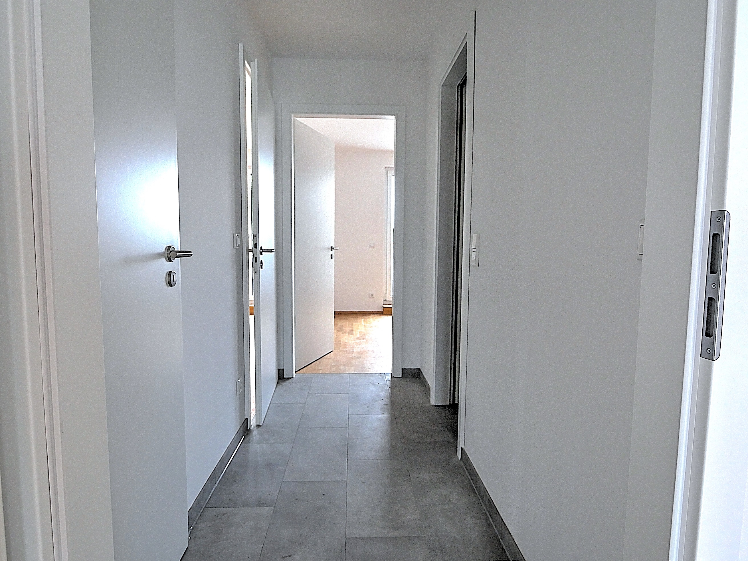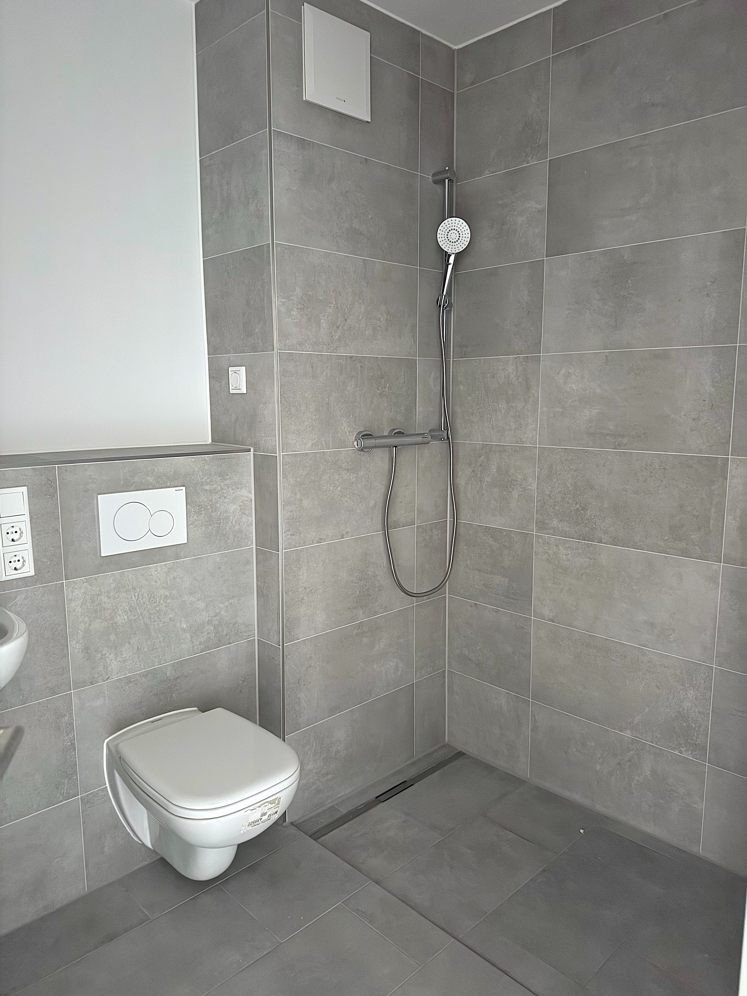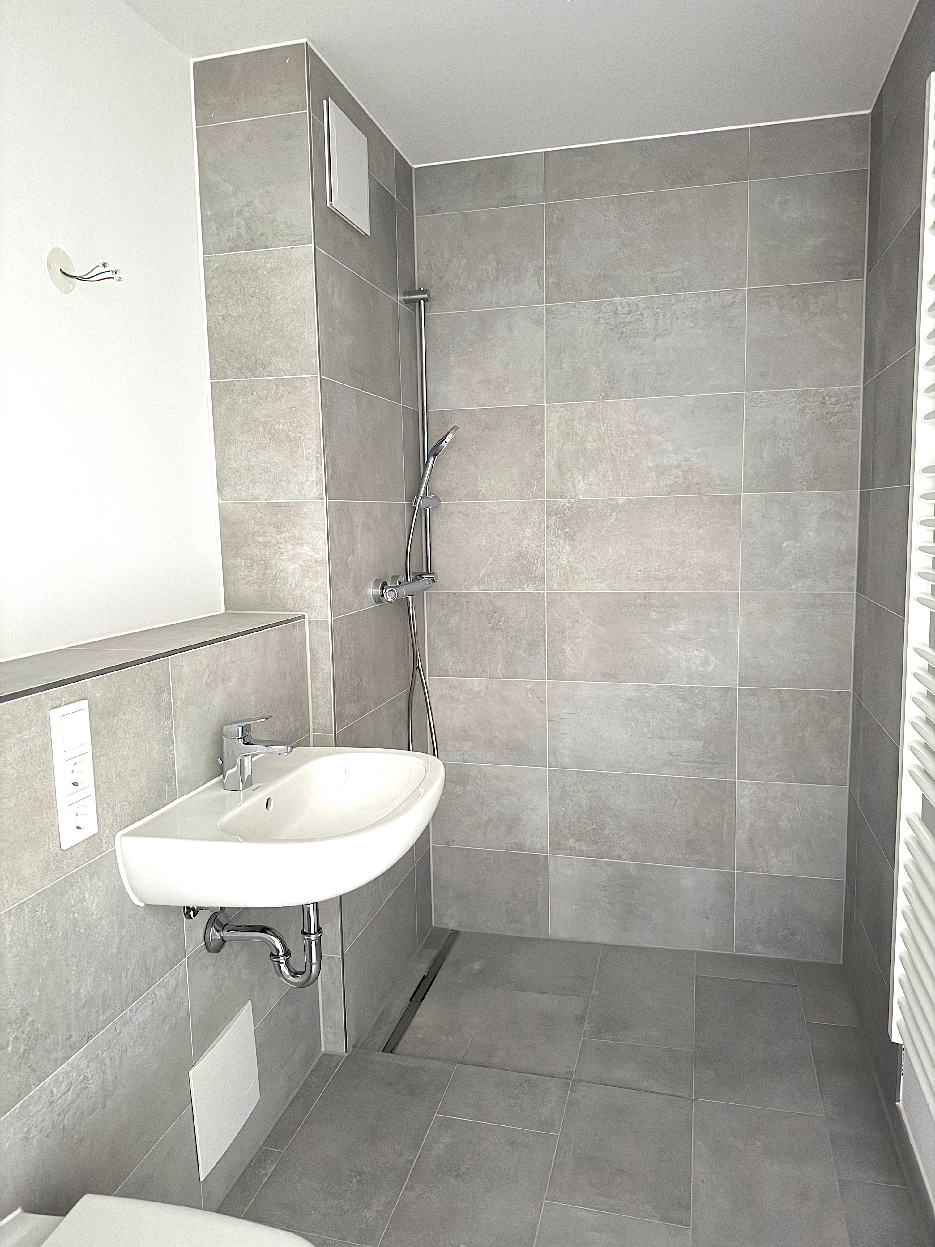 Beim Betreten der Wohnung gelangen Sie in einen freundlichen Eingangsbereich mit hochwertigem Parkettboden. Direkt angrenzend befindet sich ein helles Schlafzimmer, das sich ideal als Kinder- oder Gästezimmer eignet. Ebenfalls vom Flur erreichbar ist ein modernes Badezimmer mit bodengleicher Dusche und WC.