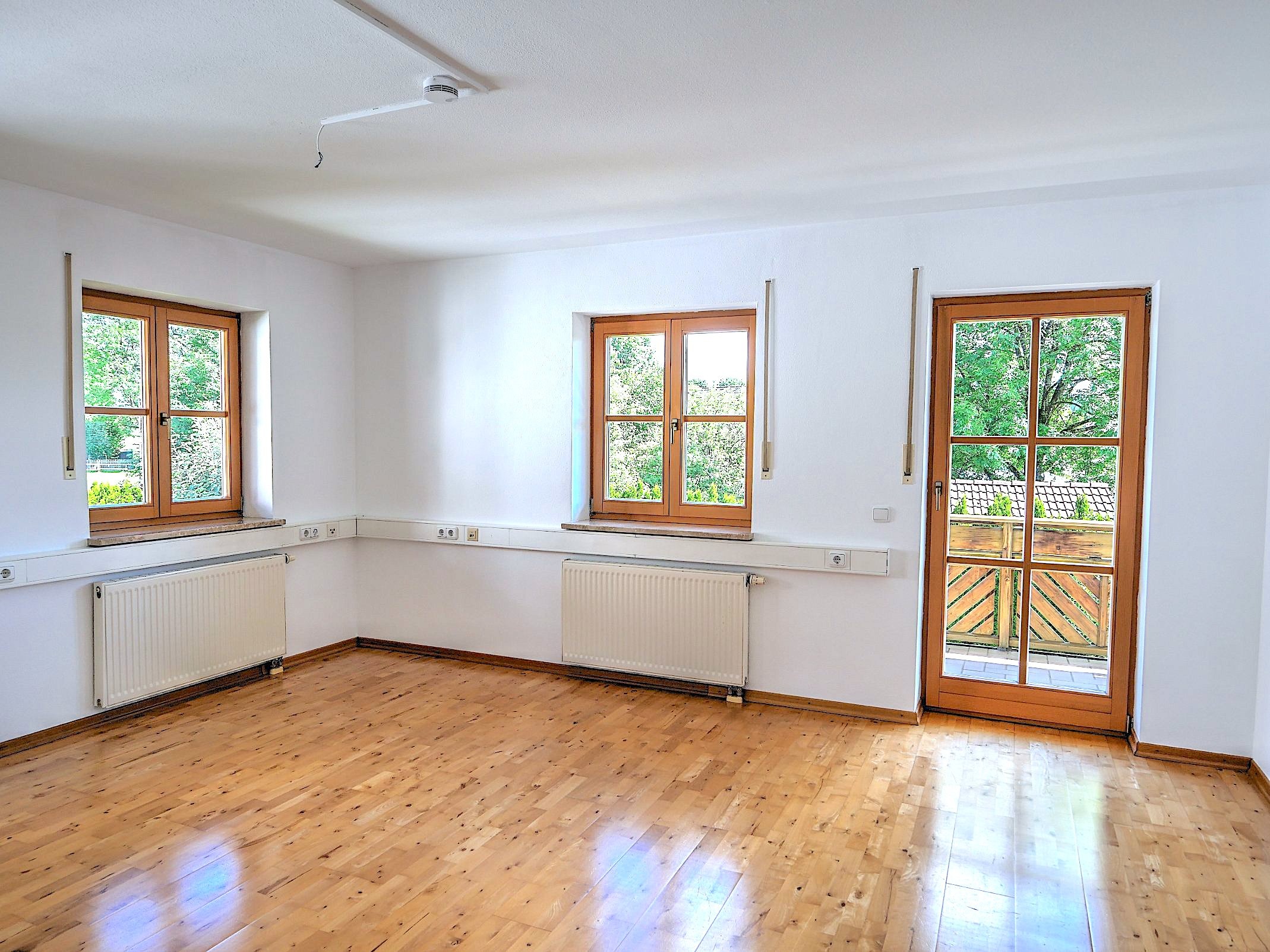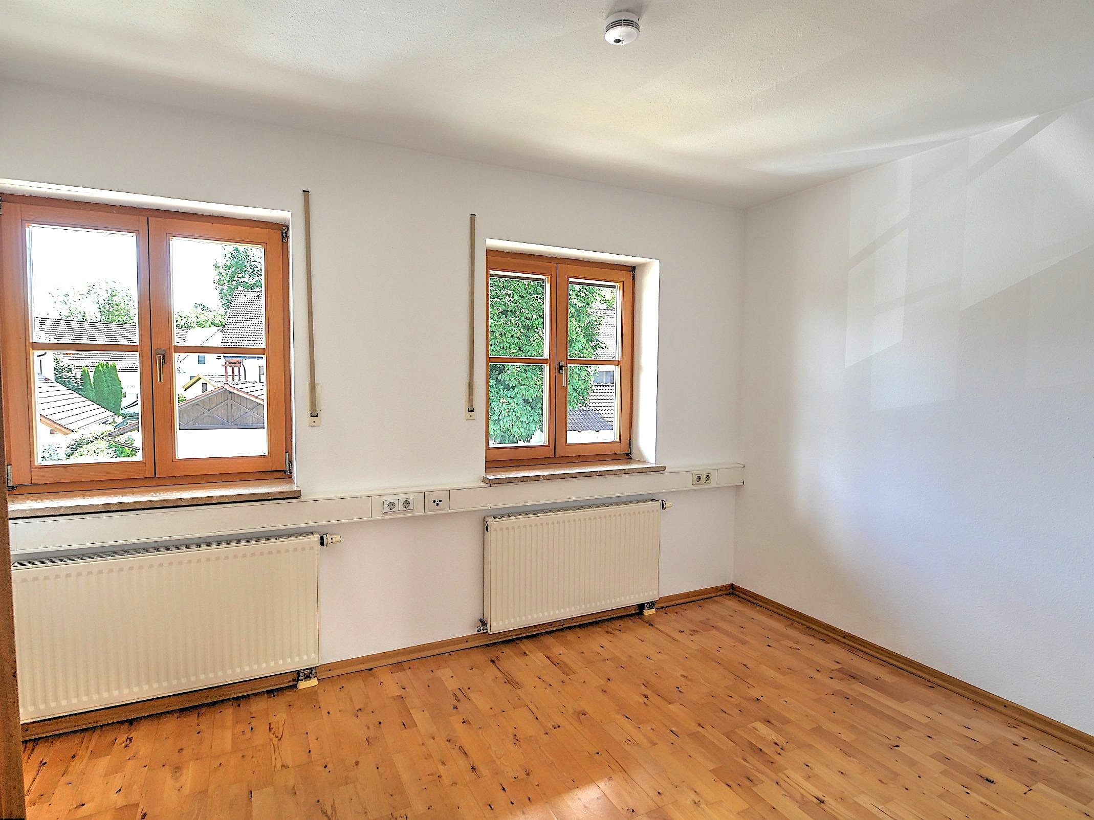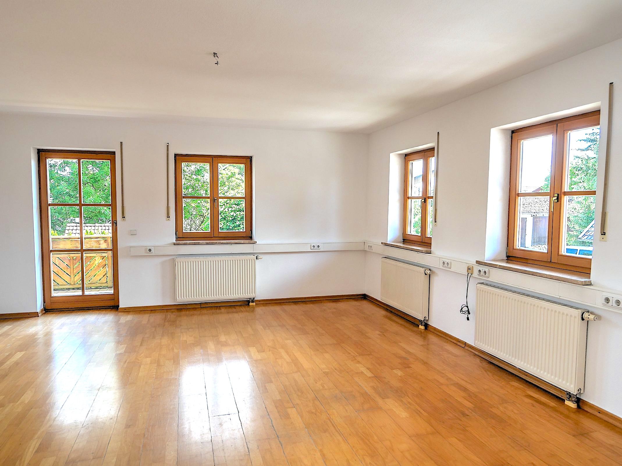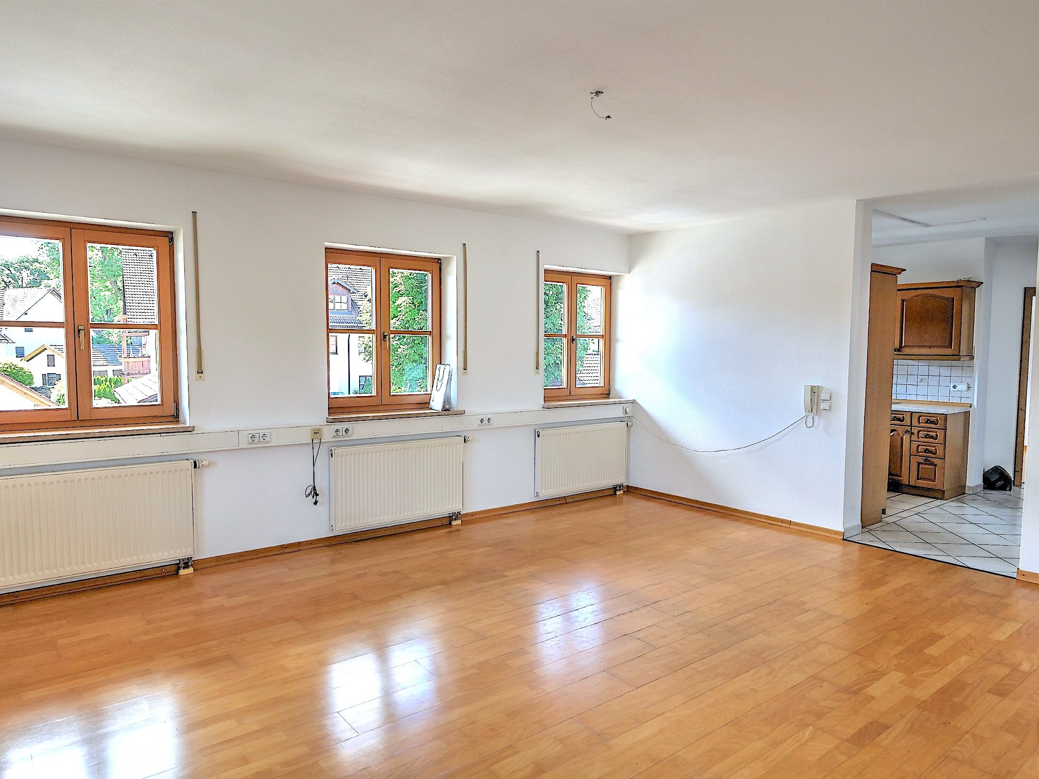 Das großzügige und lichtdurchflutete Wohnzimmer bildet das Herzstück der Wohnung. Zahlreiche Fenster sorgen für eine helle Atmosphäre und bieten ebenso wie das Kinderzimmer direkten Zugang zum sonnigen Balkon mit Südausrichtung – ein idealer Ort zum Entspannen und Genießen der ruhigen Umgebung.Das Raumangebot wird ergänzt durch ein geräumiges Elternschlafzimmer, eine praktische Abstellkammer sowie ein großzügiges Badezimmer mit Badewanne, separater Dusche und Fenster. Zusätzlich steht ein Gäste-WC zur Verfügung. Im Badezimmer befindet sich außerdem der Anschluss für die Waschmaschine.