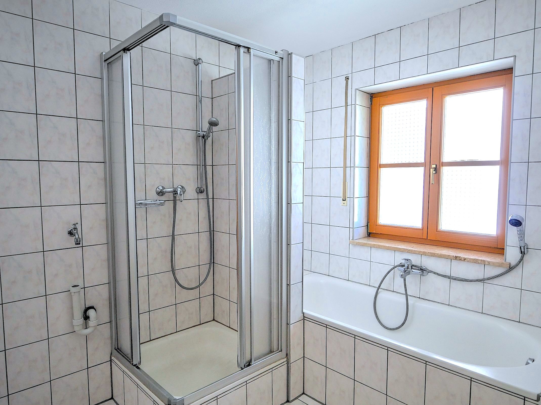 – Badezimmer mit Fenster, Badewanne, separater Dusche und Waschmaschinenanschluss