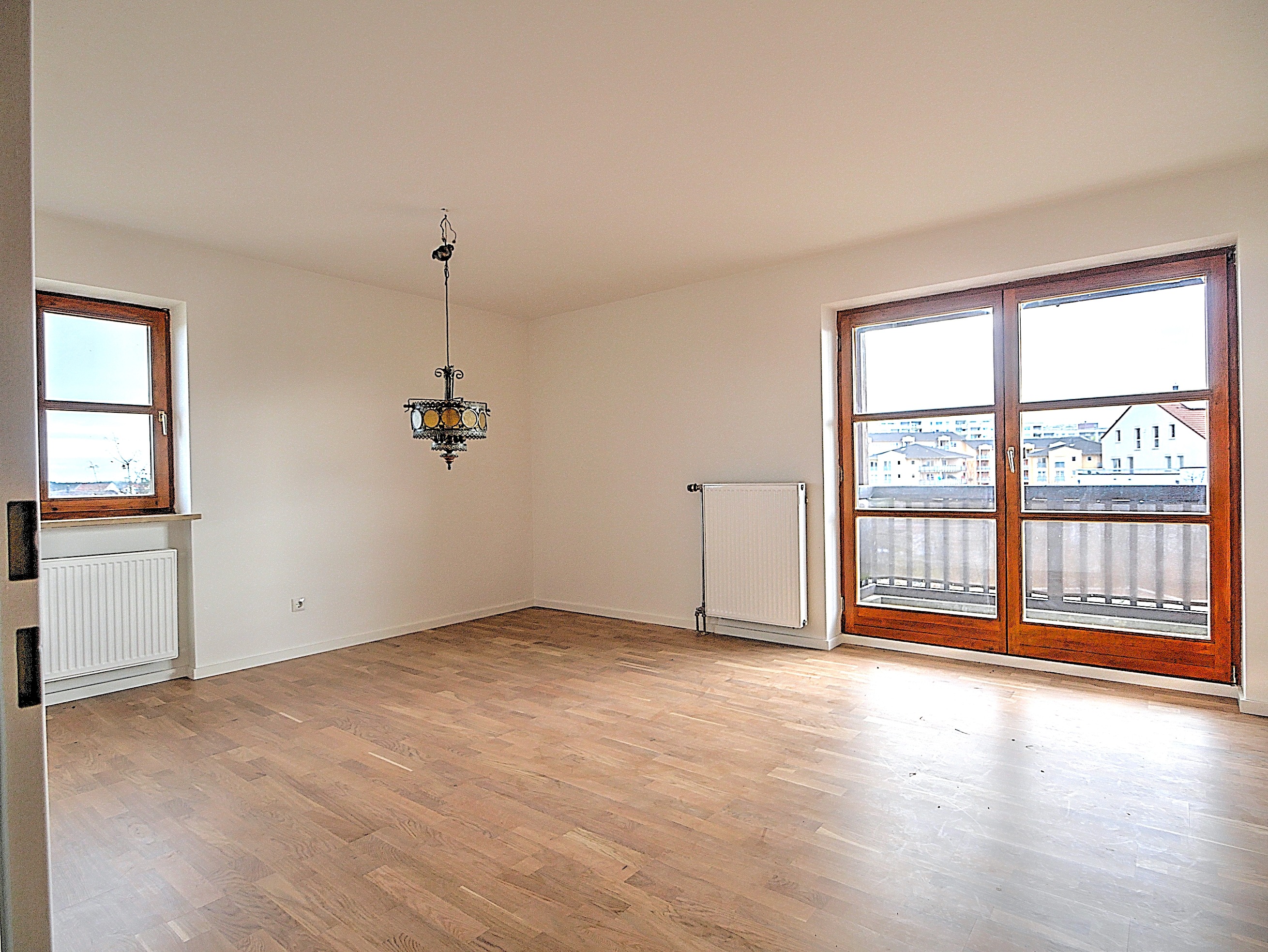 Der Wohn- und Essbereich sowie der Flur sind mit hochwertigem Eichenparkett ausgestattet, das den Räumen eine warme und elegante Atmosphäre verleiht. Vom Wohnzimmer aus gelangen Sie auf den sonnigen Balkon mit Süd-Ost-Ausrichtung, der zu entspannten Stunden im Freien einlädt.