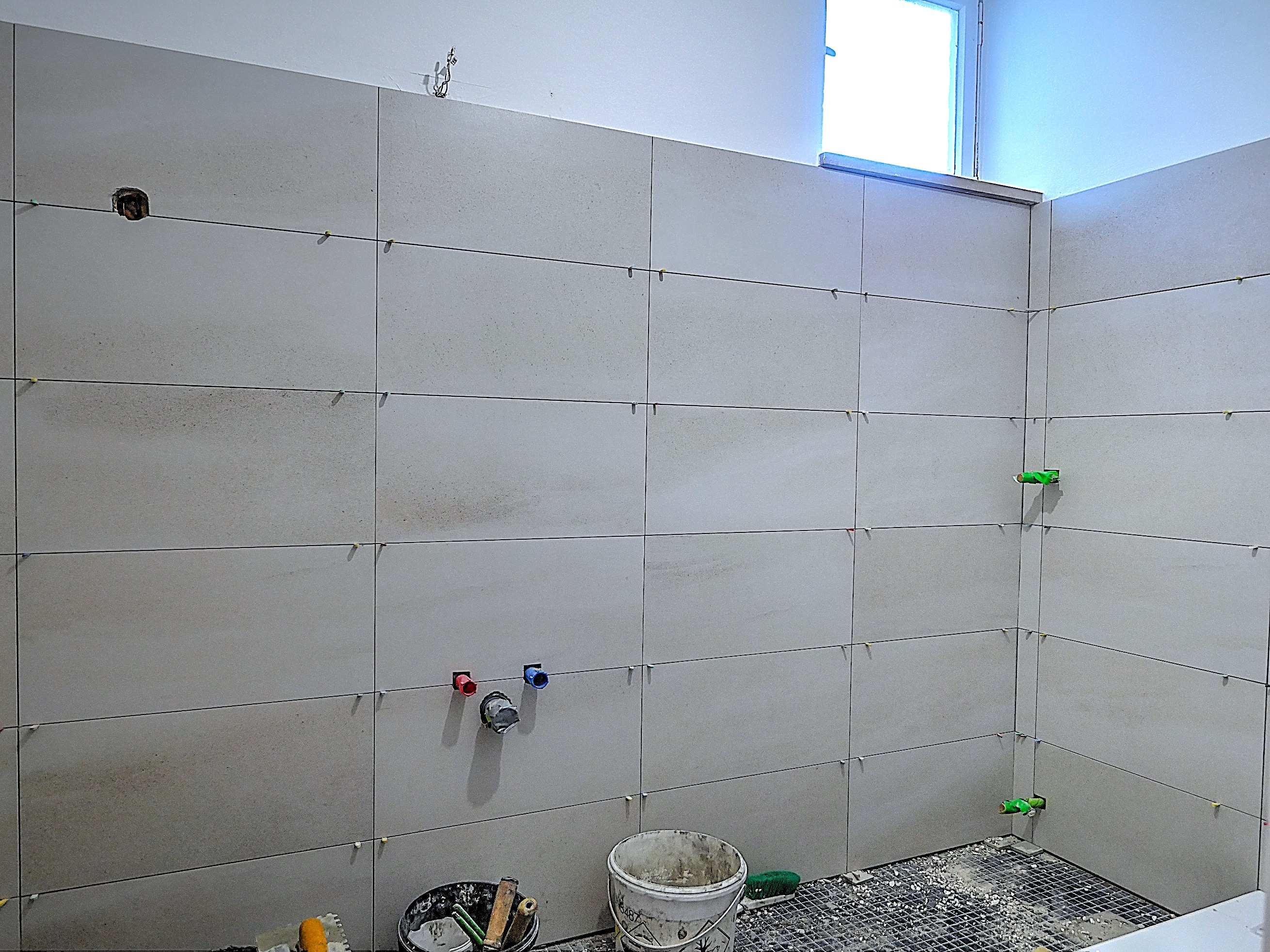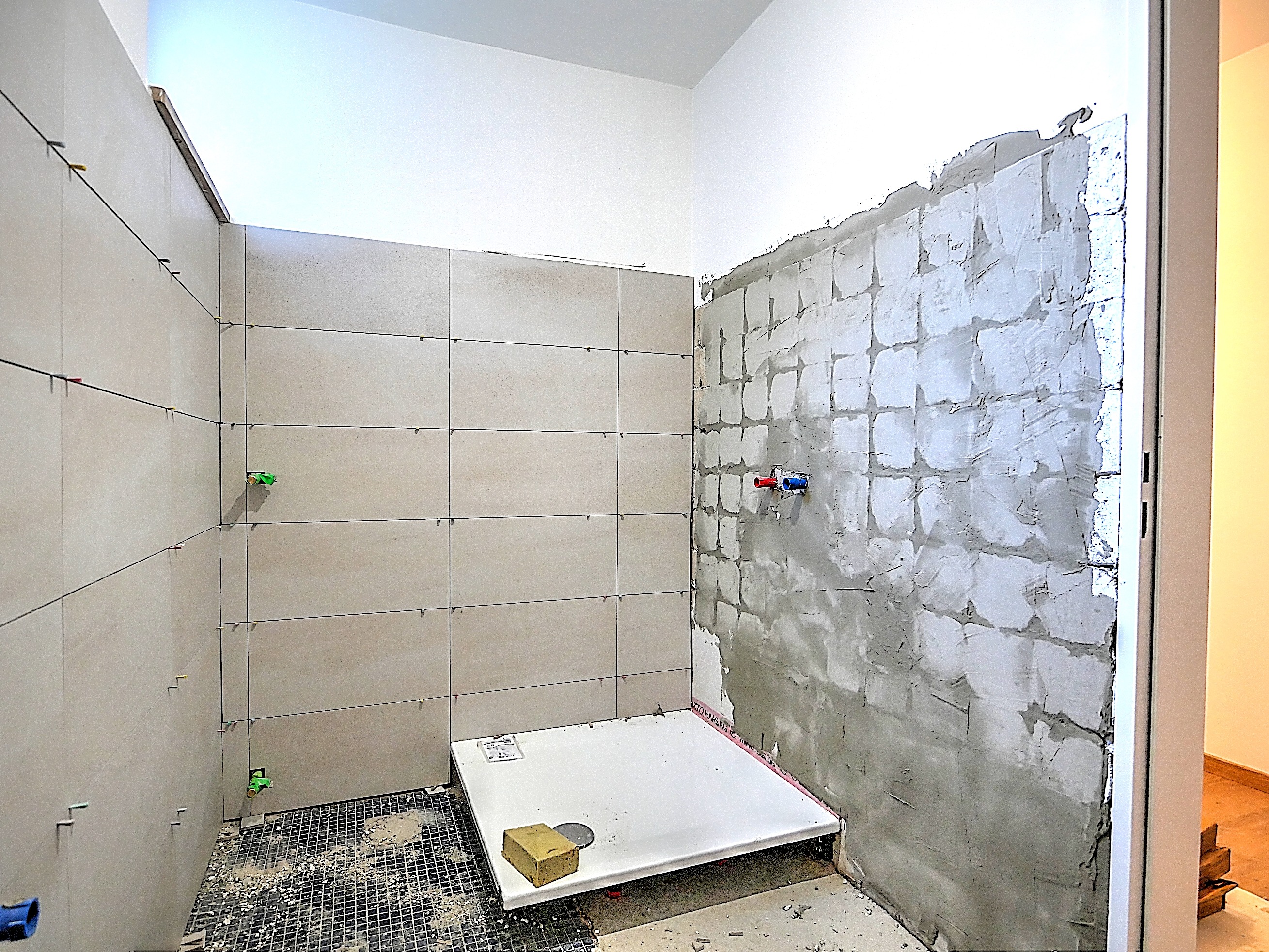 – Neues Badezimmer mit Dusche, Fenster und Waschmaschinenanschluss