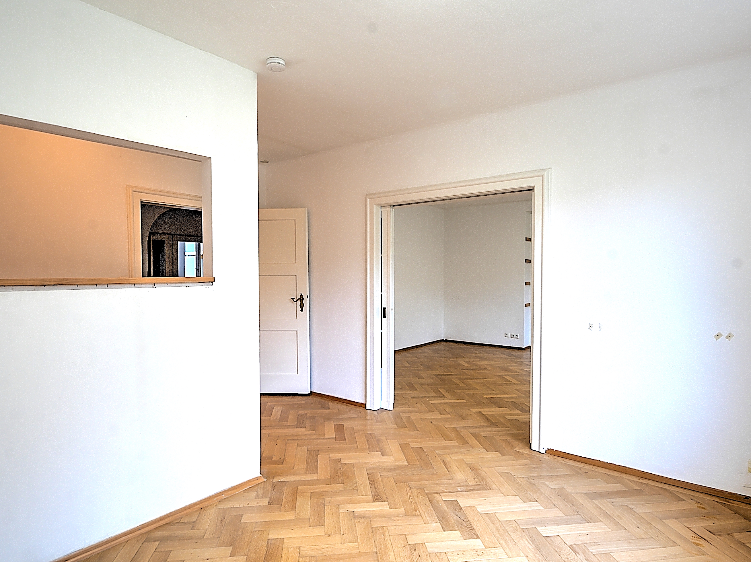 Das Schlafzimmer bietet eine clevere Raumaufteilung mit einer zusätzlichen Wand, die sich ideal als Arbeitsbereich oder begehbarer Kleiderschrank nutzen lässt. Der Übergang vom Wohnzimmer erfolgt durch eine praktische Schiebetür, die den Raum optisch und funktional vergrößert. Die vorhandene Einbauküche steht Ihnen zur Verfügung – alternativ haben Sie die Möglichkeit, Ihre eigene Küche mitzubringen.