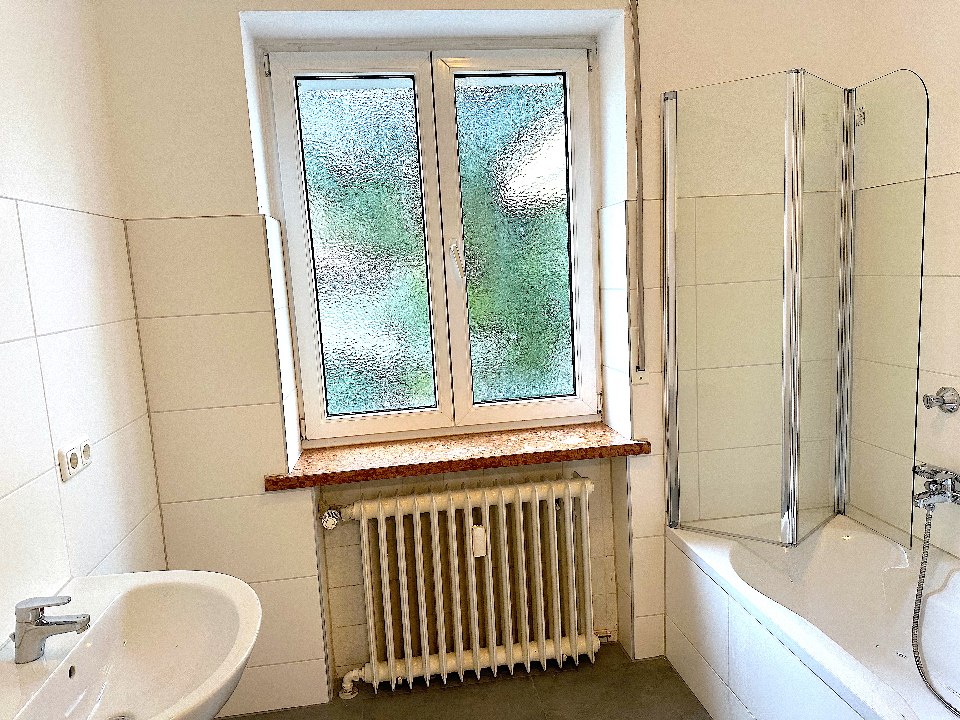 – Renoviertes Badezimmer mit Badewanne, Waschmaschinenanschluss und Fenster