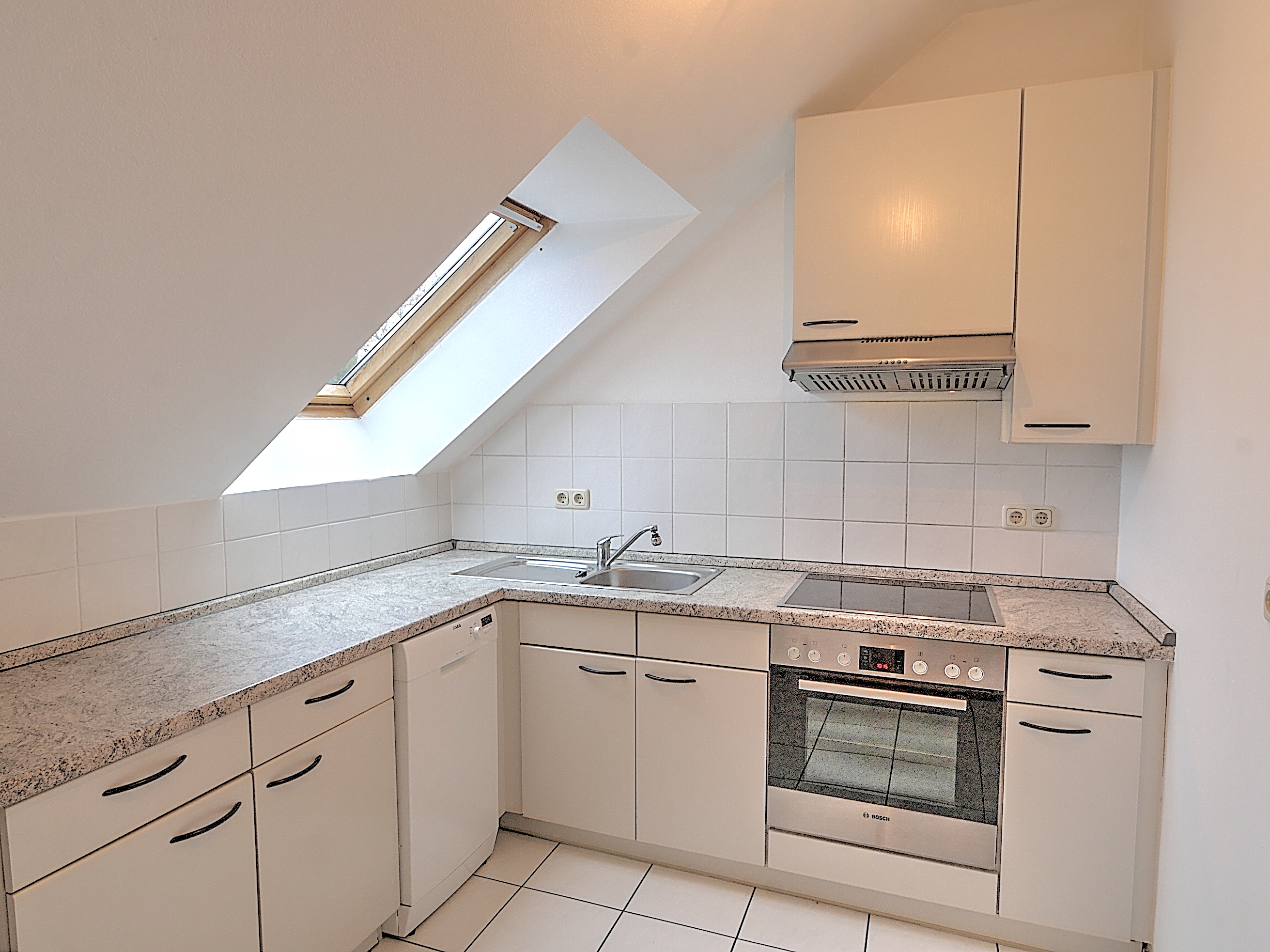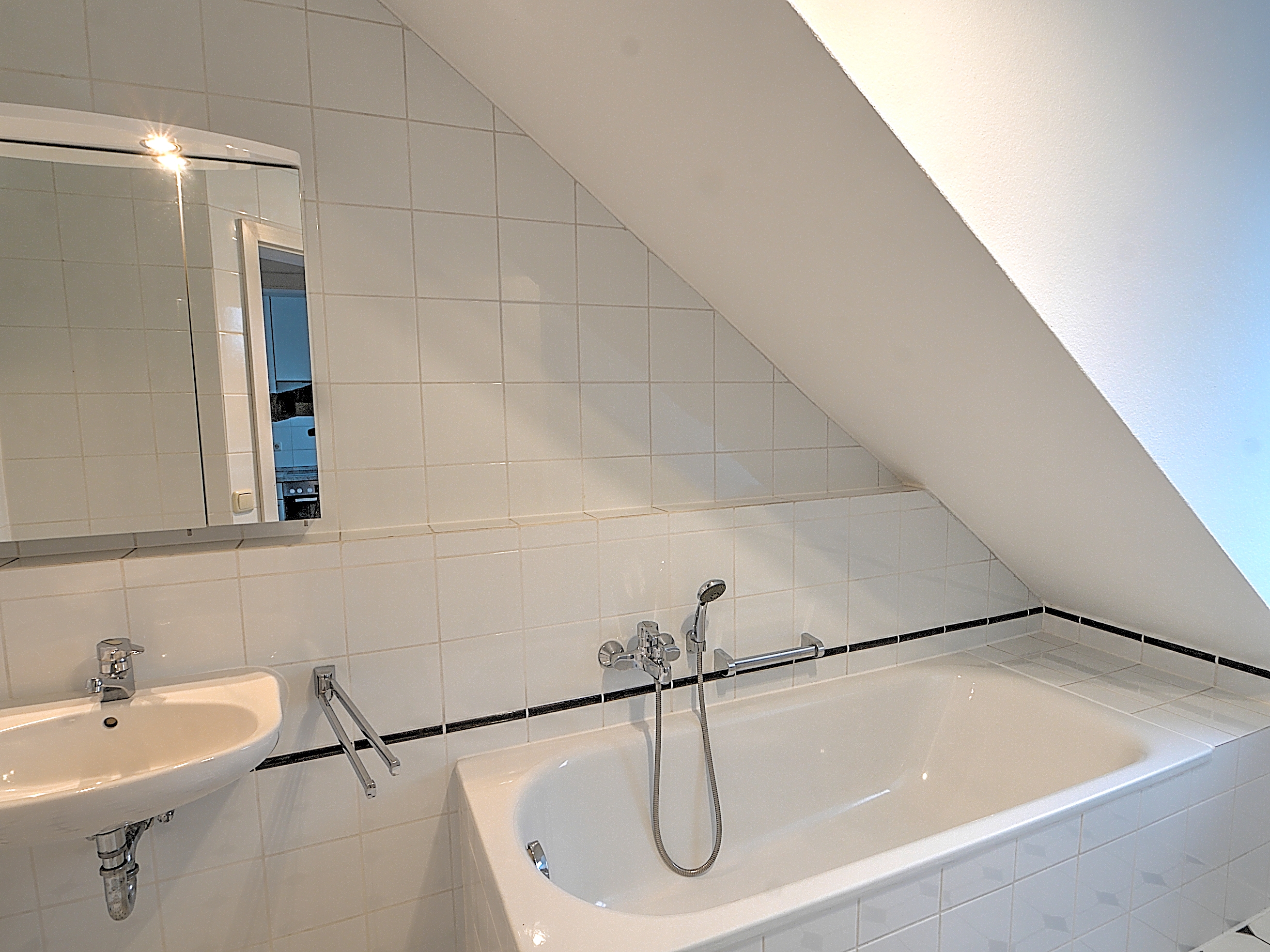 Beim Betreten des Objektes überzeugen das gepflegte Treppenhaus und die Großzügigkeit der Räume mit vielen Dachgauben, die die Wohnung zu einem hellen und freundlichen Lebensraum machen und einen besonderen Flair verleihen. Komplettiert wird die Zwei-Zimmerwohnung durch ein natürlich belichtetes Badezimmer mit Badewanne, sowie ein Schlafzimmer, die ebenfalls durch ihre Dachschrägen optisch gefallen. Ein Flur und eine eingepasste Einbauküche machen das Angebot komplett.