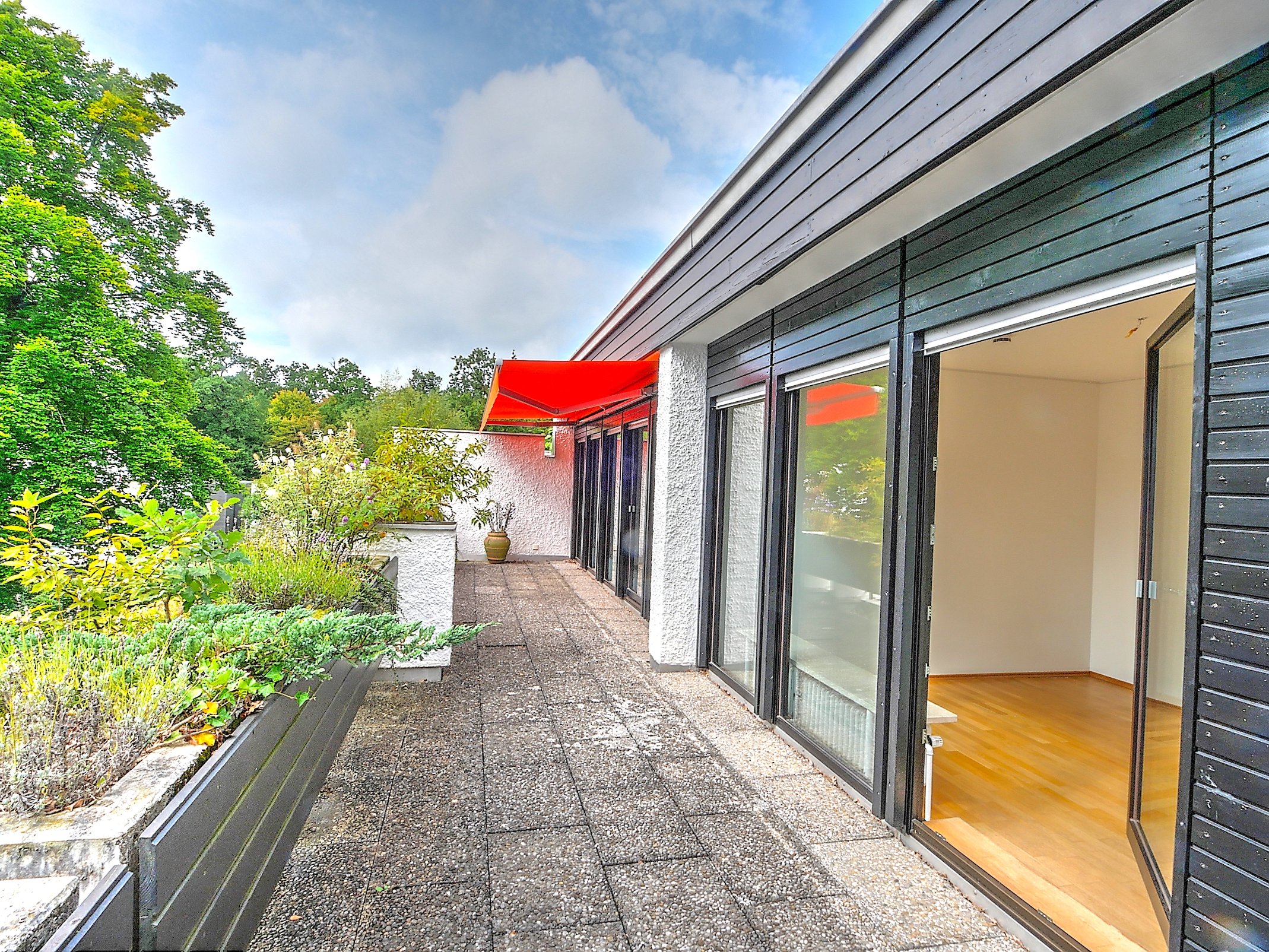 Die großzügige Dachgeschosswohnung mit ca. 110 m² Wohnfläche vereint Licht, Raum und eine ruhige Wohnatmosphäre. Bereits beim Betreten öffnet sich das XL-Wohnzimmer, dessen große Fensterflächen den Raum in warmes Südlicht tauchen. Von hier aus gelangen Sie auf die sonnige Süd-Dachterrasse, die mit ihrer Markise und dem herrlichen Blick ins Grüne ein hohes Maß an Privatsphäre bietet – ideal zum Entspannen und Genießen.