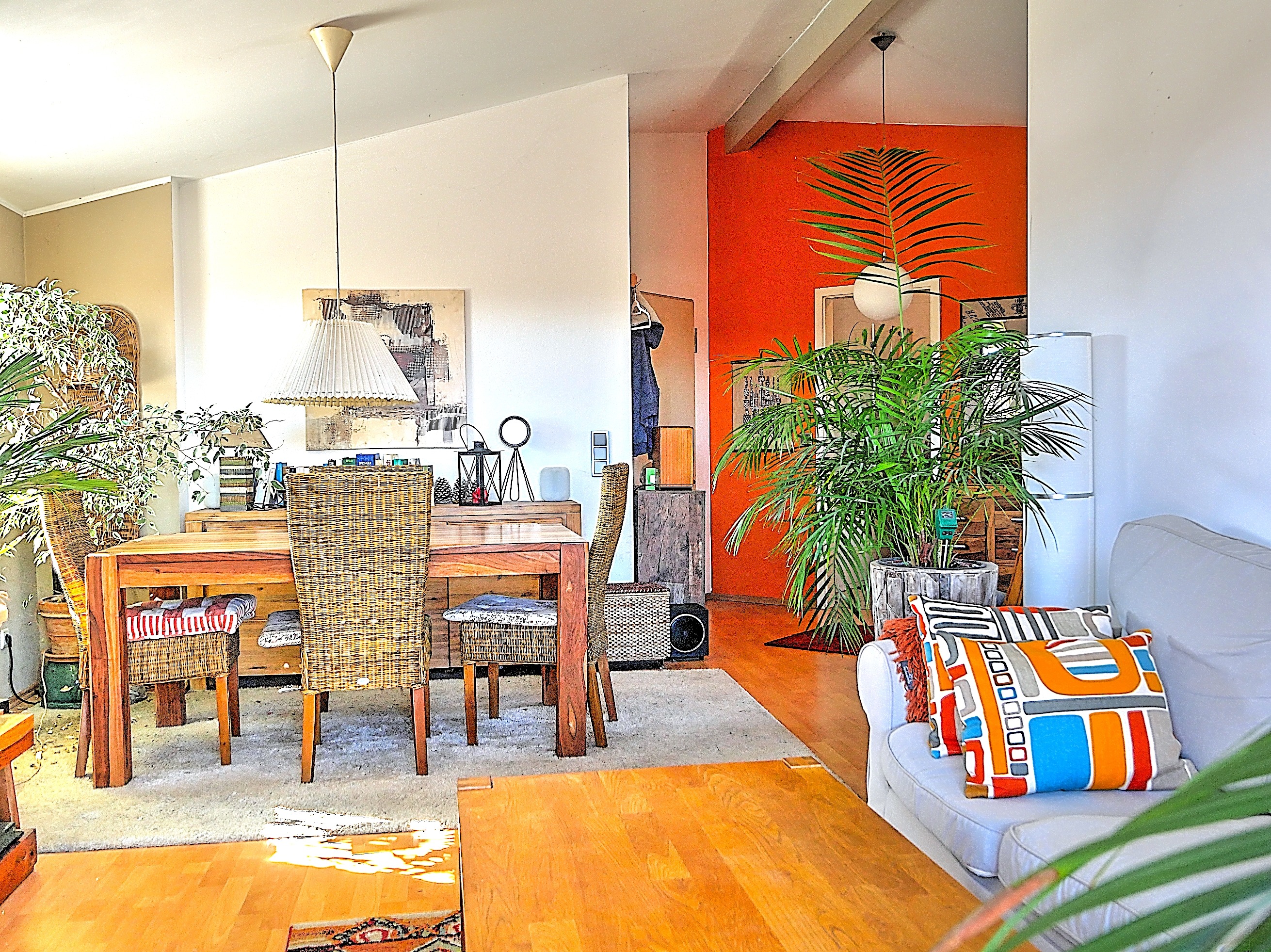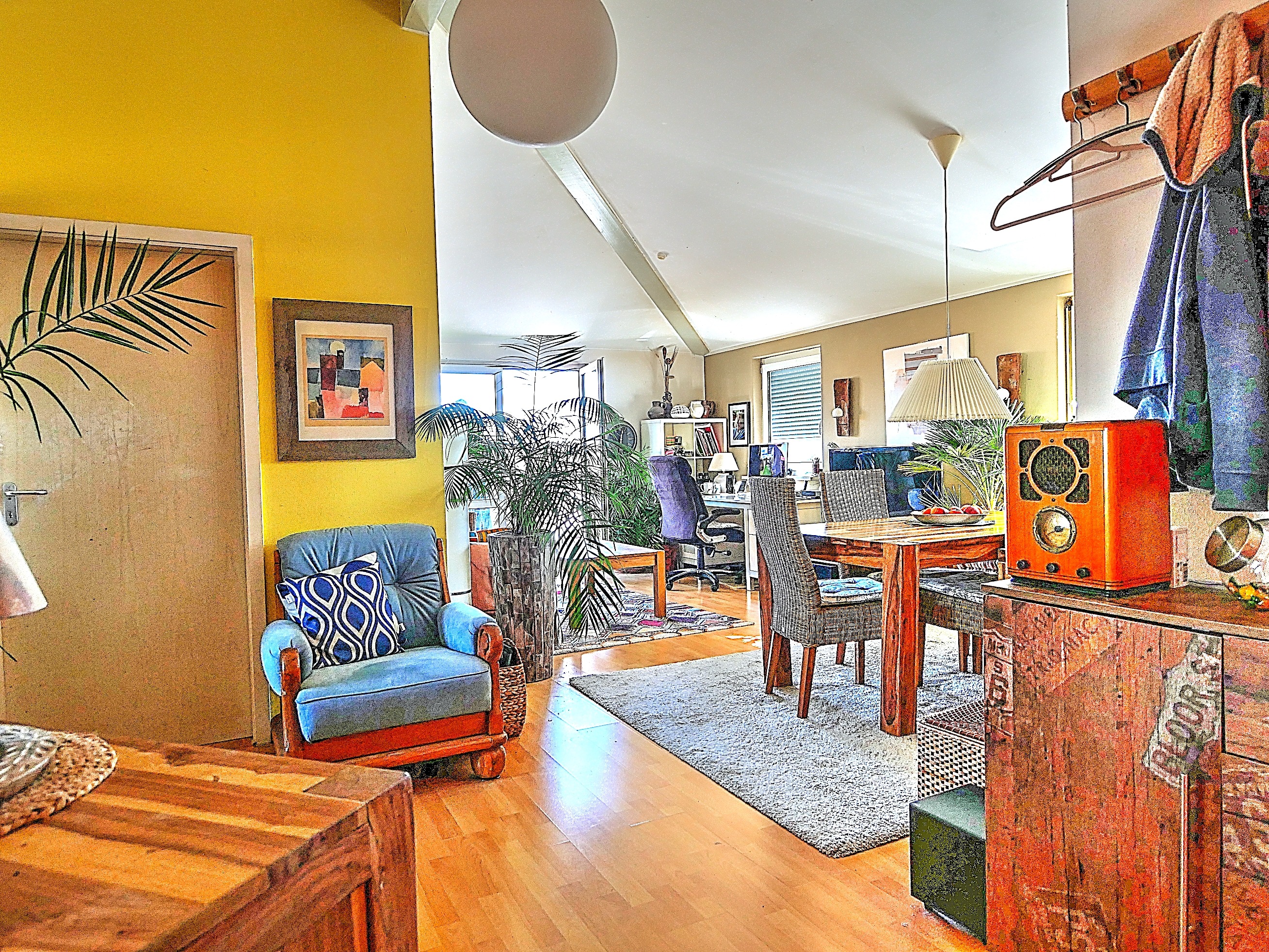 Die Wohnung befindet sich im Dachgeschoss und ist bequem sowohl über das Treppenhaus als auch per Lift erreichbar. Bereits beim Betreten spürt man den besonderen Charakter: Die Dachschrägen sorgen für eine angenehme Wohnatmosphäre und verleihen den Räumen mit ihren hohen Wänden eine luftige, zugleich behagliche Wirkung. Der durchgehend verlegte Laminatboden unterstreicht das warme Wohngefühl.
